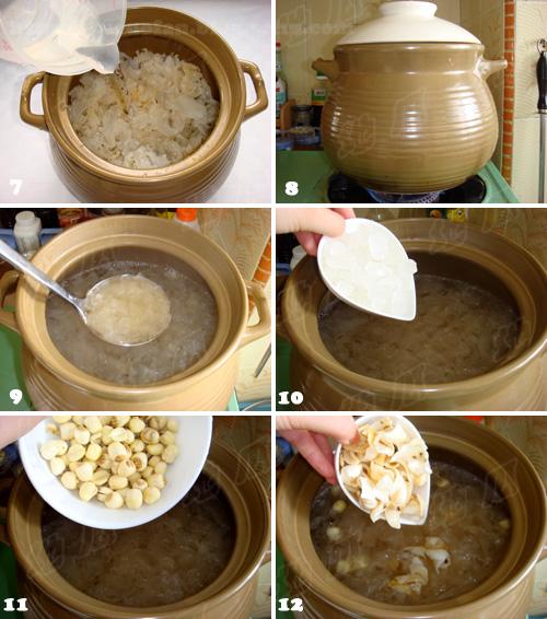 做法:洗净所有材料,红枣去核,白木耳泡水浸软。锅中注入8分满水,水开后,放入所有材料,以大火煮20分钟,转至小火煮2小时即可