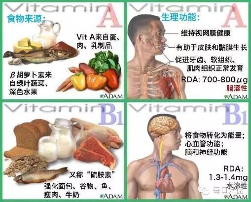获取适量的维生素是保持健康的必要条件,如果摄取的维生素达不到身体所需,就会引起不适,导致各种健康问题。那么,维生素们的功能都有哪些呢?我们的日常生活中又要从哪些食物中获得维生素呢?看完下面这4张图你就知道了!
